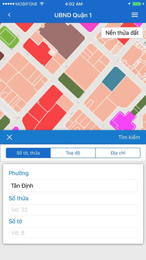 + Tìm kiếm thông tin thửa đất theo Số tờ, số thửa, theo Toạ độ hoặc theo Địa chỉ.