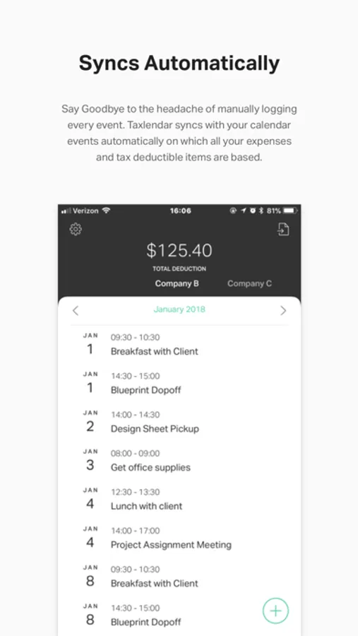 • Once you create your work schedule/appointments/events/activities in your regular calendar app such as iCalendar, Taxlendar will sync your schedule automatically.