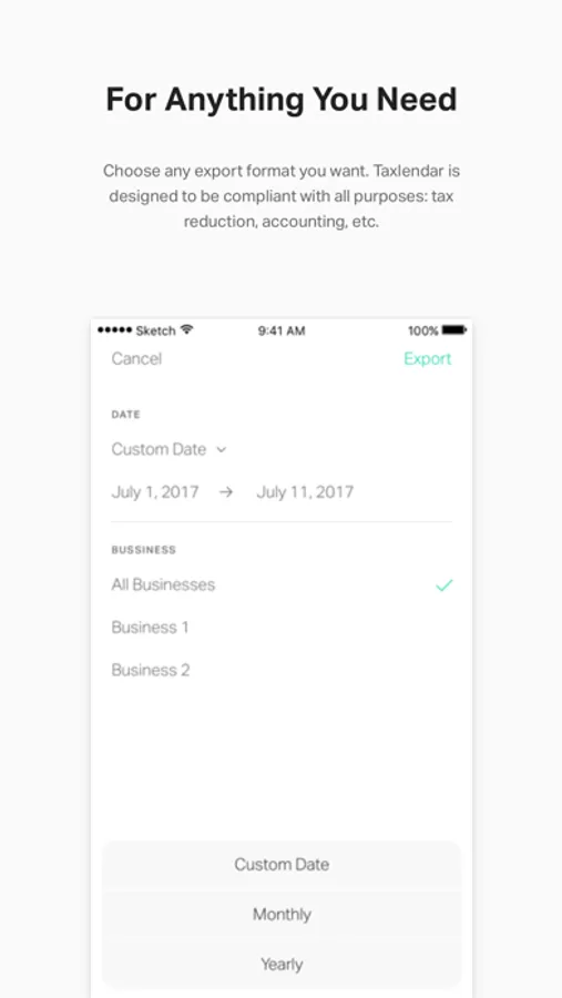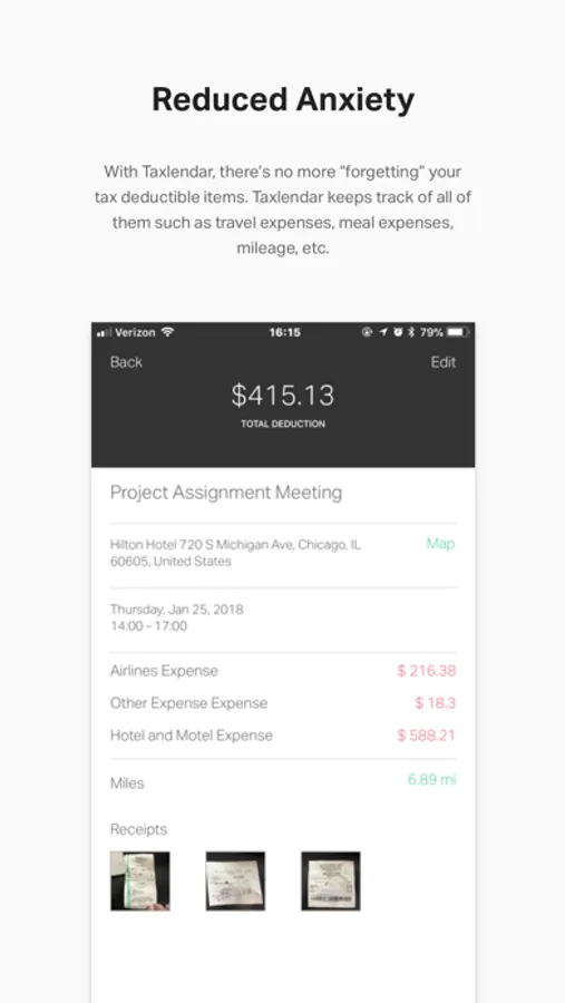 • Need a tax log to give to your CPA/accountant? Just export your detailed tax log by clicking few buttons in Taxlendar! “Travel expense”, “Meal and Lodging”, “Vehicle Expense” and “Other expense” can be exported right away! Also, your receipt images will be attached.