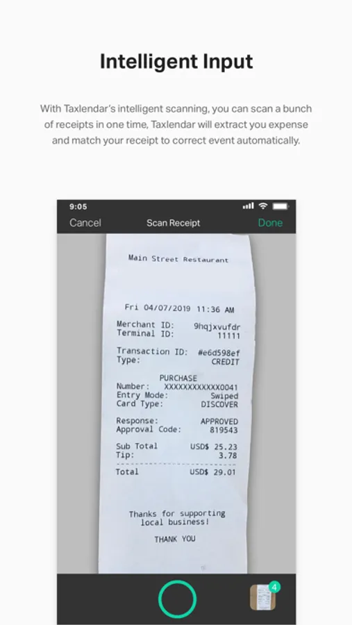 • Don’t have time to scan receipts right after the event/meeting? Scan all your receipts when you get some free moments, Taxlendar will find the correct event/meeting on your calendar based on the time on the receipt and save your receipts with that event/meeting.