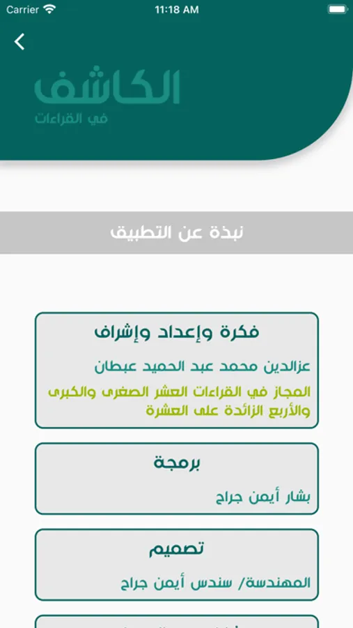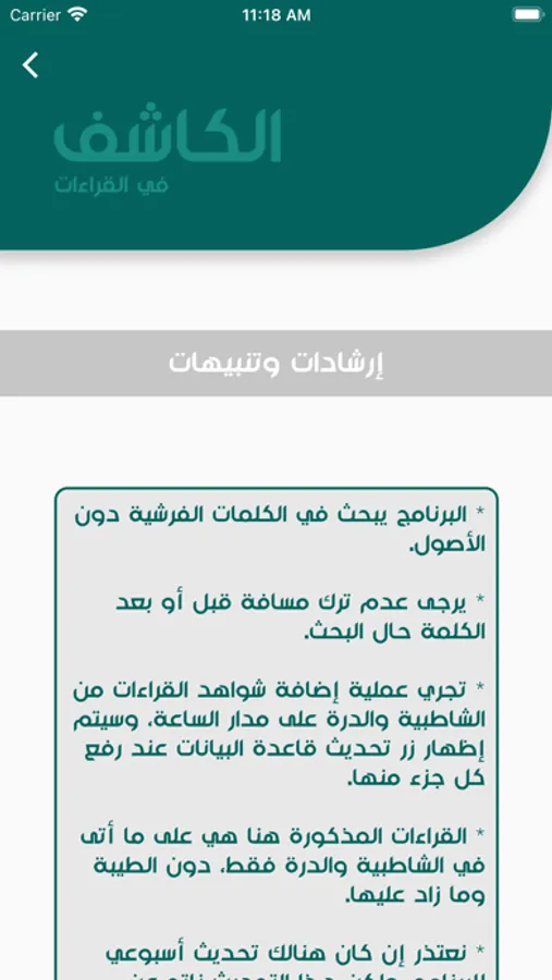 برنامج الكاشف في علم القراءات هو برنامج يبحث في الكلمات القرآنية التي ورد فيها قراءة قرآنية أم لم يرد، في إطار القراءات العشر الصغرى من طريقي الشاطبية والدرة، علماً أن الكمال لله وحده والنقص ملازم لبني الإنسان، فنرجو التواصل معنا لأي ملاحظة أو خطأ عبر صفحة التواصل، ونسأل الله الإخلاص وأن يوفقنا لإتمام العشر الكبرى والأربعة الشاذة.