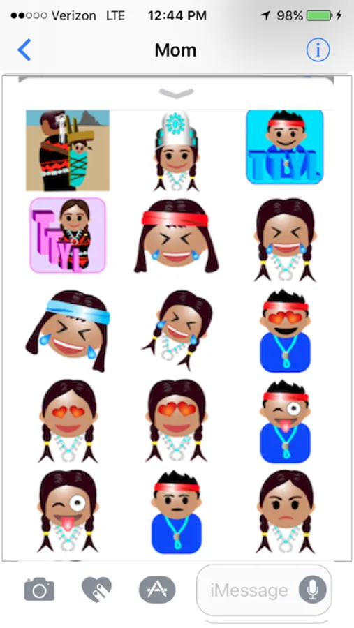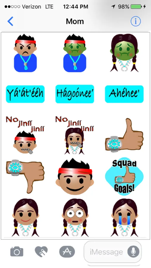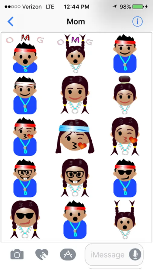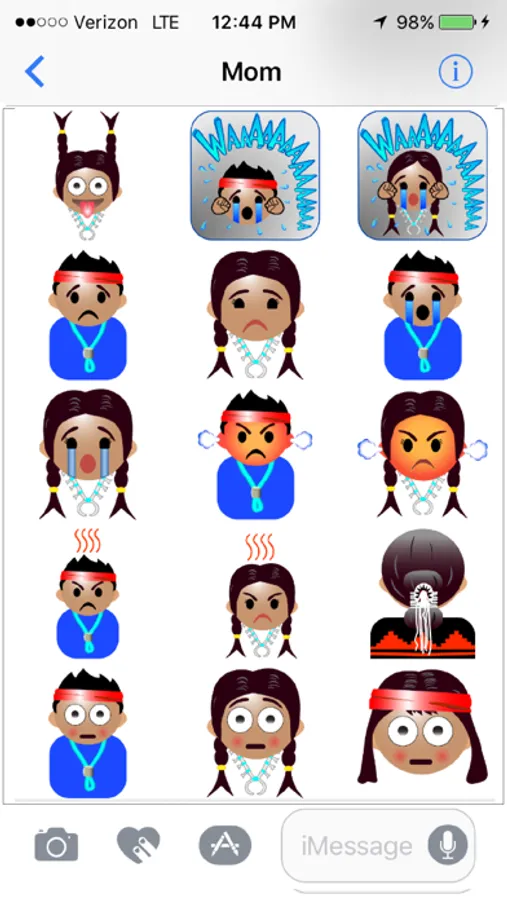 The Navajo Emojis Sticker App features male and female stylized Navajo emojis. It includes 17 animated emojis, 47 static (non-moving) emojis and 5 Navajo words (hello, bye, thank you). Females are featured wearing a traditional squash blossom necklace. Men are featured wearing a red, blue or white traditional headband. Some boys are wearing a turquoise necklace while sporting a modern haircut. The animated emojis are male and female with bulging love eyes, blinky eye with tongue sticking out, frowny face, teary eye, blinking cradle baby, and laughing so hard they cry. Static emojis include smiley face, heart kiss, nerd glasses, sunglasses, surprise face, sad face, crying stream, mad with head steam, orange face mad, green face sick, waaah crying, blushing, no gossip(jiníí), TTLY, Squad, Goals, Princess, thumbs up & down, and a woman's head with (tsiiyee) bun!
