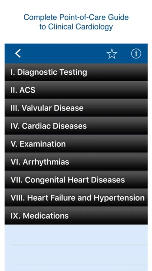 The app is logically divided into nine sections: Diagnostic Testing, Acute Coronary Syndrome, Valvular Diseases, Cardiac Diseases, Examination, Arrhythmias, Congenital Heart Diseases, Heart Failure and Hypertension, and Medications.