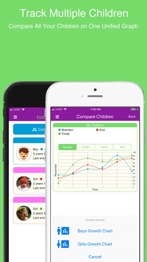 • Compare your children. All your children will be graphed on one single graph for easy comparison.