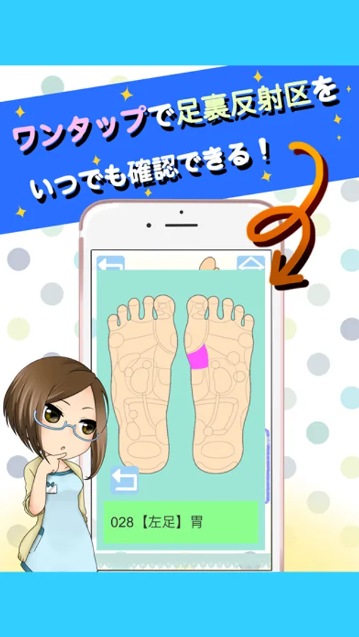 解説中にワンタップで表示される足裏反射区図では、施術中の対応する反射区をすぐ確認可能です。