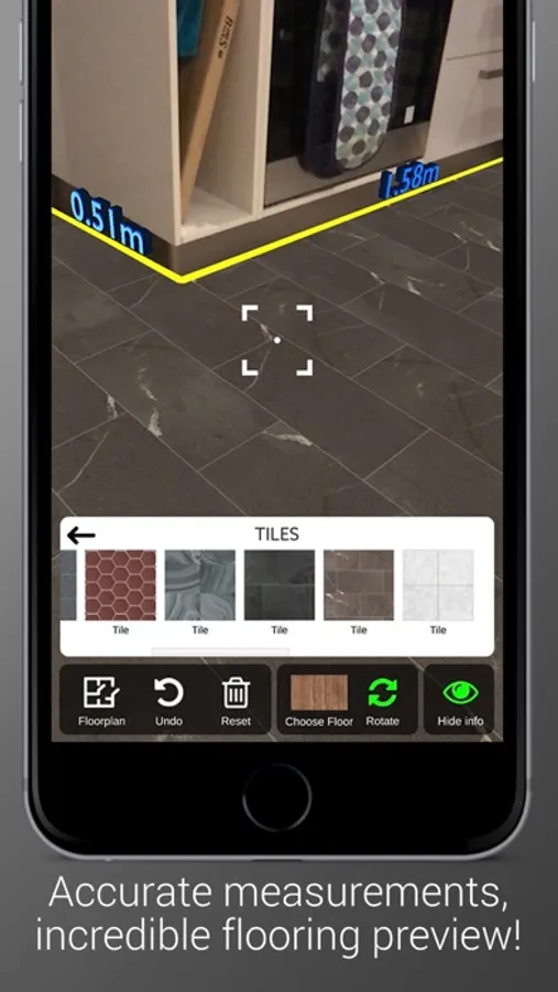 • Toggle information display to see measurements and area, or a pure image of what your new floor might look like