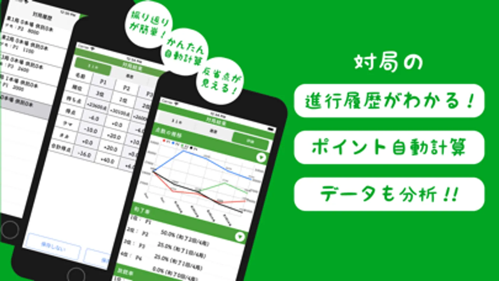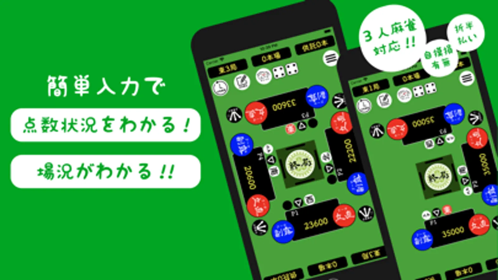 全員の点数、場風、供託棒、積み棒を1画面に表示し、一目で把握