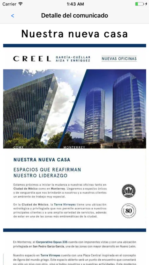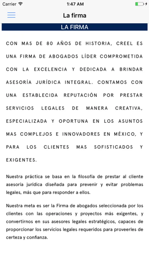Creel App es la aplicación oficial de Creel, García-Cuéllar, Aiza y Enríquez S.C., la cual ha sido construida para mantener los altos estándares de comunicación y servicios de la firma para con sus socios y colaboradores. Al acceder a ella, todos los socios y colaboradores podrán encontrar información referente a las instalaciones, directorio, políticas y procedimientos, entre otra información propia de la firma.