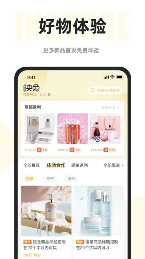 品牌不设限,口碑好物很重要,在消费中获得产品体验以及返利现金,可0元试用,全额返利喔~