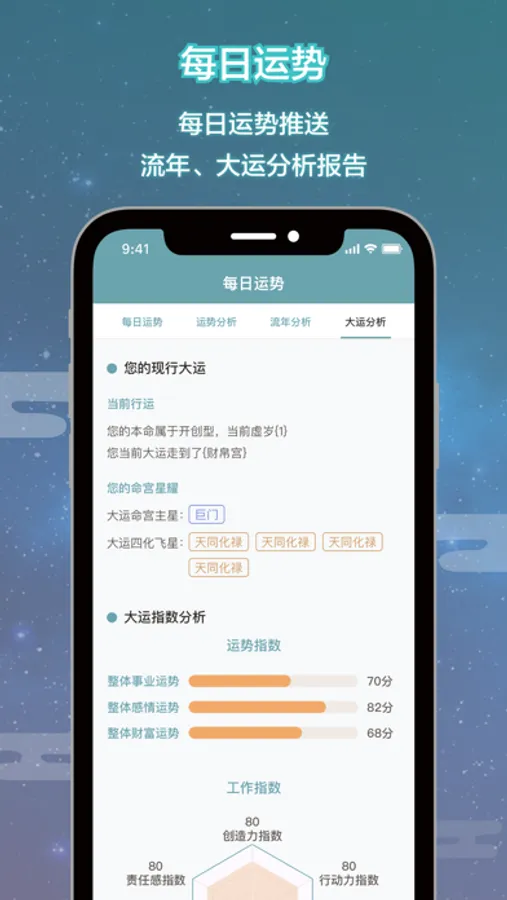 通俗易懂——通过大量的命理经典文献,融合诸种复杂的分析逻辑,呈现给用户最简洁明了的语言;