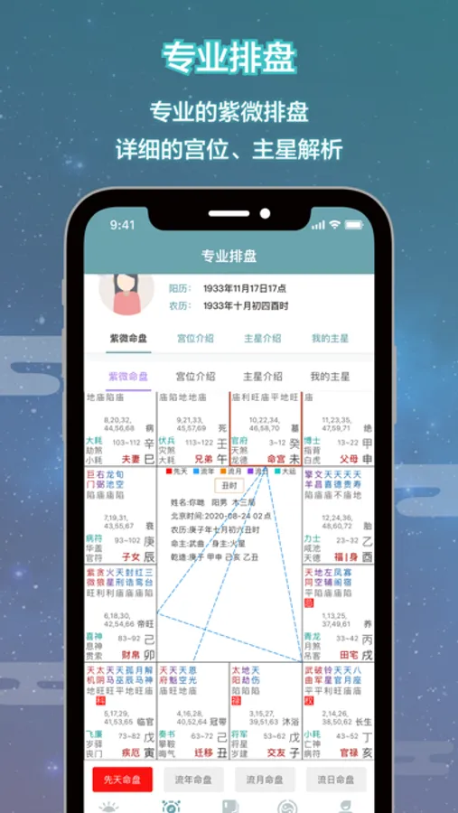 专业的紫微排盘软件,以天干地支阴阳五行为基础,通过对星象的分析及人星关系的定位推演紫微排盘及紫微详解。