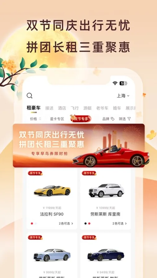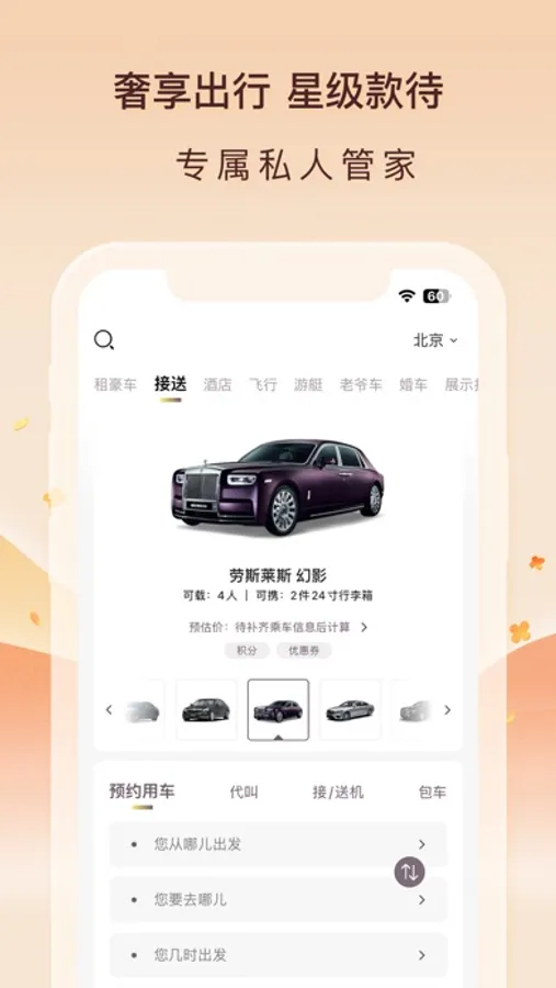 奢华出行:预约制点对点五星级接送服务,标配全球一线豪华品牌经典商务车型,尽享奢华人生。