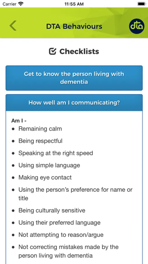- Checklists on communication, behaviours, and getting to know the person with dementia.