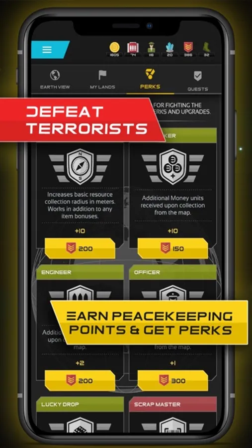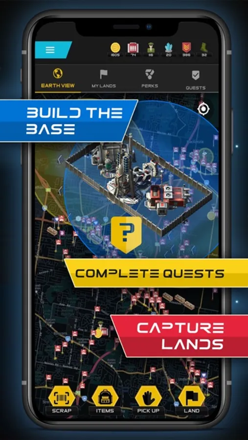 Construction resources will pop up all over the globe, so in the process of their collection you can explore places you've never seen before. Why not go hiking or cycling? Explore and adventure to secure valuable resources! Traveling to another country? Don't forget to check in five times in any spot to establish a new base of operations. Once you've collected enough resources you can send your armies to the overseas base in order to advance your influence remotely, even after you've left!