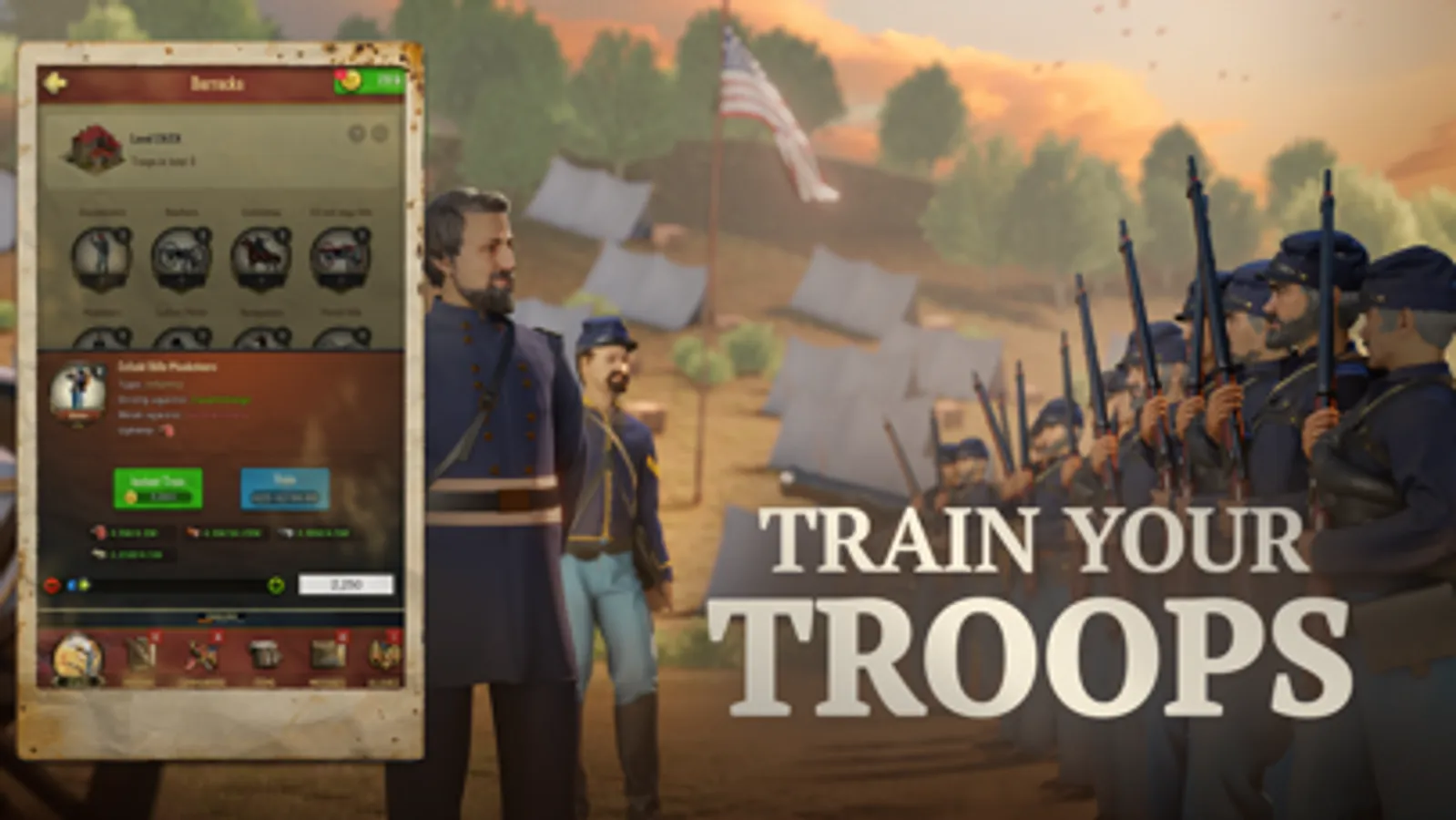 Build your empire and send your soldiers to the battlefield. Real time strategy will determine which side wins and sets the course of American history. Use base building to create your camp and customize your army with soldiers of all kinds: infantry, cavalry or heavy artillery.