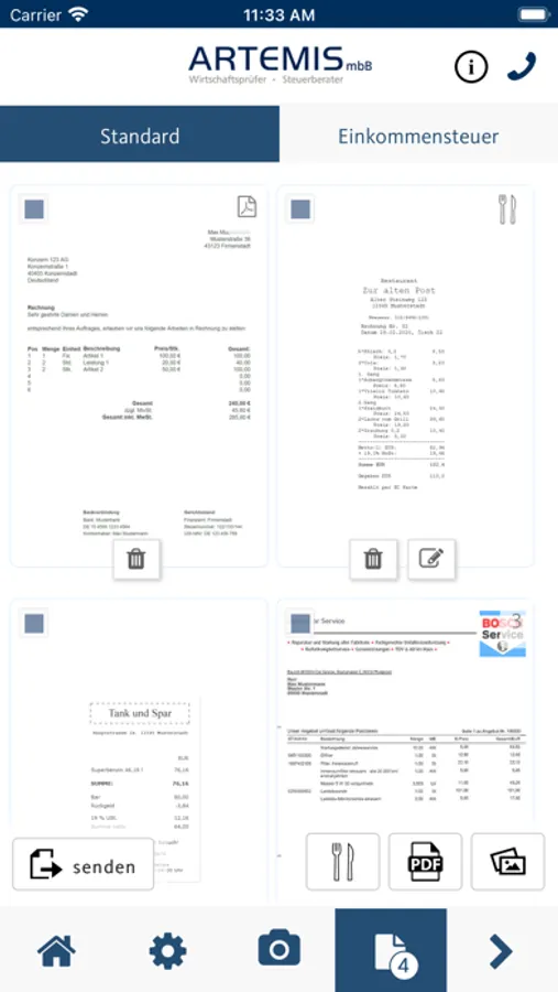 Machen Sie einfach ein oder mehrere Fotos von Ihren Belegen und versenden Sie diese mit einem Klick direkt aus der App heraus an Artemis