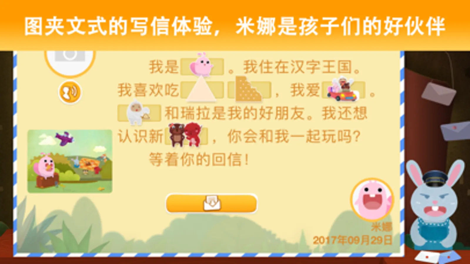 - 去写信:图文阅读新乐趣,用孩子的方式来写信。真实的收信与回信体验,让孩子对每一封来信充满期待。赶快寄出你的回信吧!