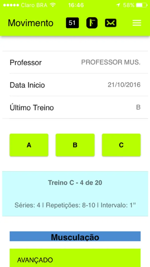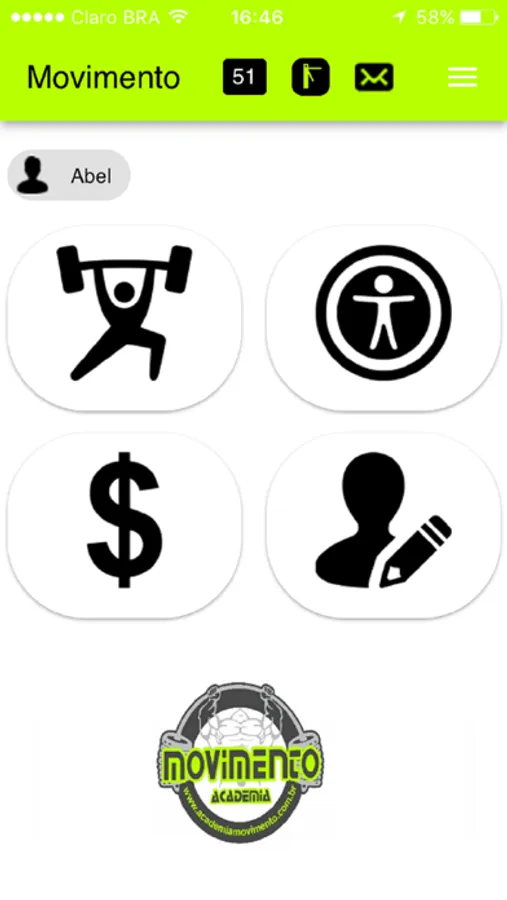 Aplicativo Movimento que permite ao aluno da academia acessar diversas informações de forma simplificada. O aplicativo permite também que o dono da academia tenha uma visão completa dos principais indicativos da sua empresa e permite que o professor efetue alterações no treino do aluno!