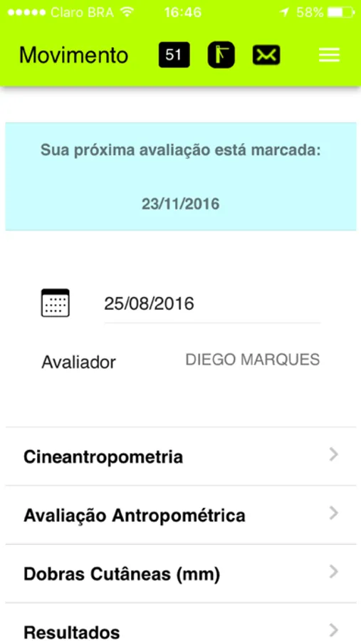 3- Avaliação: O aluno poderá visualizar suas avaliações físicas no Aplicativo.