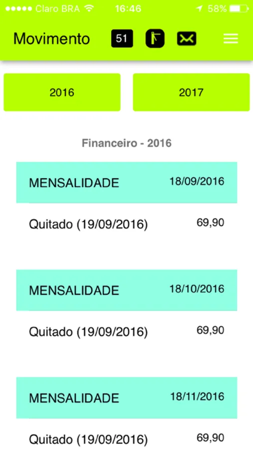 4- Financeiro: O aluno poderá verificar os valores pagos no ano atual e anterior, além de todas as mensalidades em aberto.