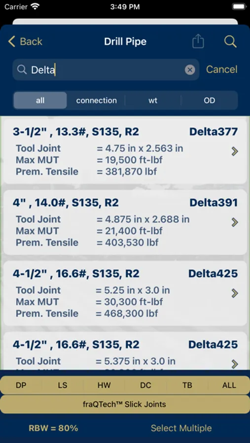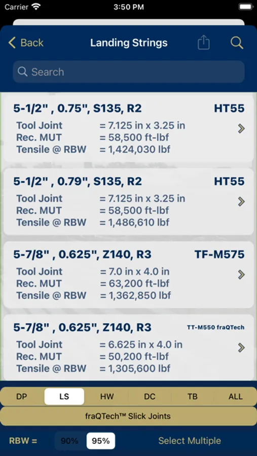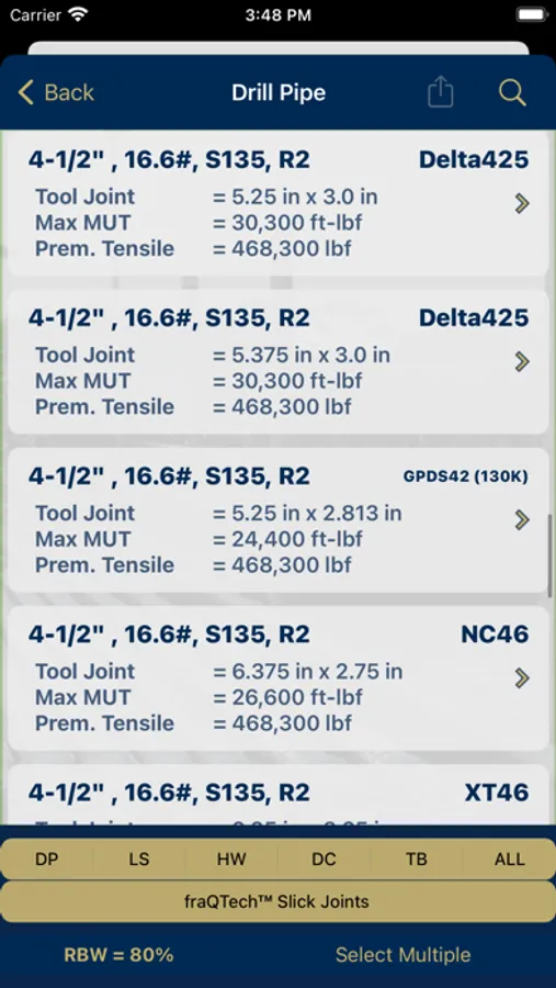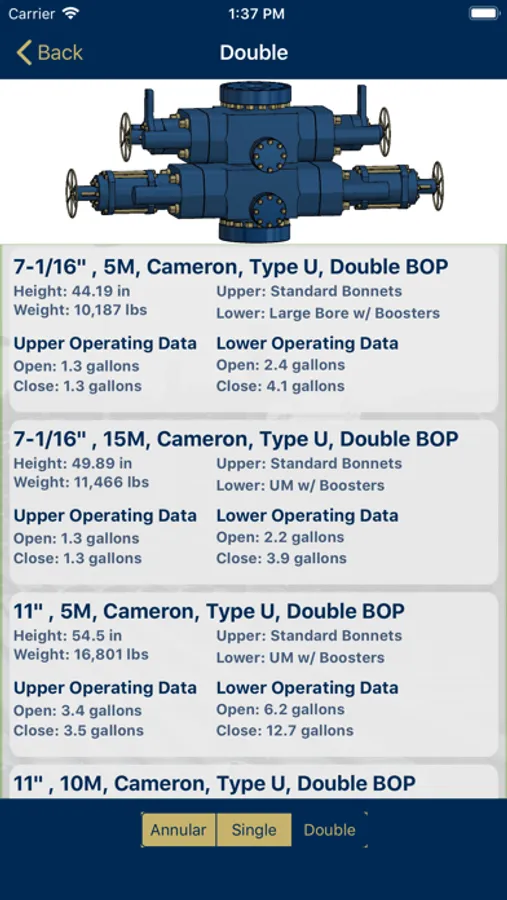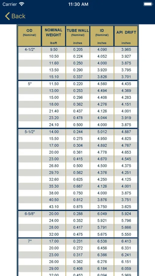 The initial page will allow the user to select between three sections of the app: Tubulars, BOPs, or Casing. Upon selecting "Tubulars" or "BOPs, the user will be presented with a built in table that contains essential information. Therefore, it does not require an internet connection to function! This will allow for constant, unhindered access to tubular and BOP information such as: tool joint OD, tool joint ID, max make up torque, premium tensile, BOP height, BOP weight, BOP pressure rating, BOP bonnet type, BOP operating data, and BOP shear testing videos. Upon selecting the "API Casing - General Information" button, the user will have access to a built in table containing standard API casing information. You can now view essential specs in areas where there is little or no cell phone reception.
