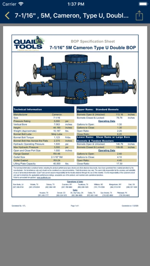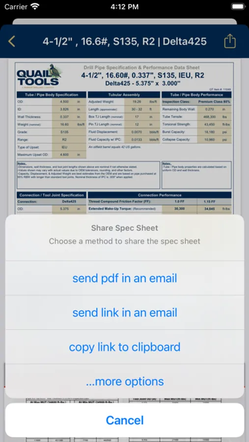 When selecting "Tubulars" or "BOPs", simply tap the item to view the spec sheet. This retrieves the spec sheet from our website, which can be shared using the button on the top right. (Please note: this function does require an internet connection). From there, the spec sheet can also be saved to your phone, or any handled via another app.