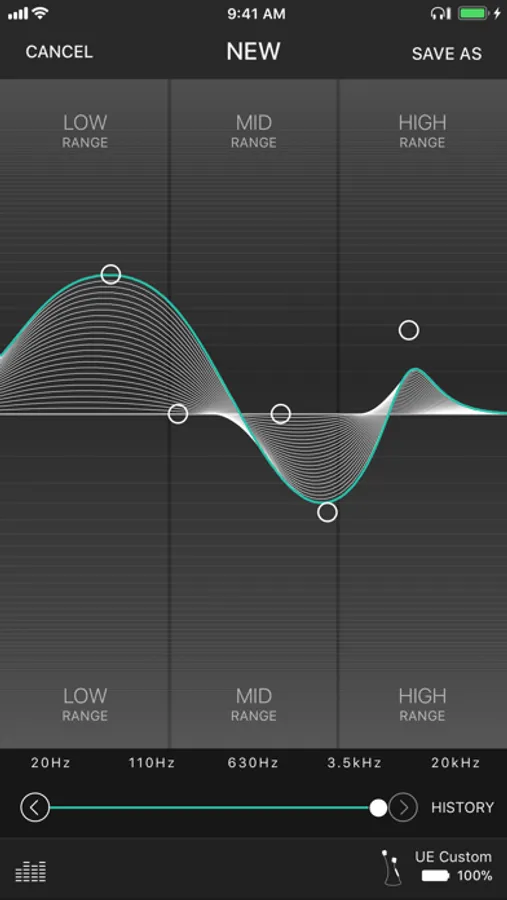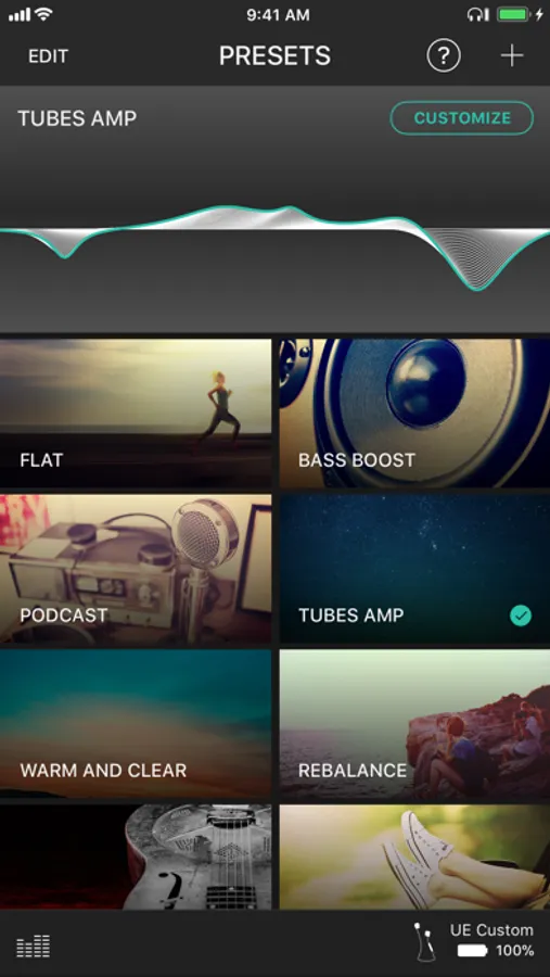 The UE Custom App allows you to customize the EQ settings of your Ultimate Ears custom fit earphones. Choose from presets optimized for different listening experiences from podcasts to heavy bass or create and save your own.