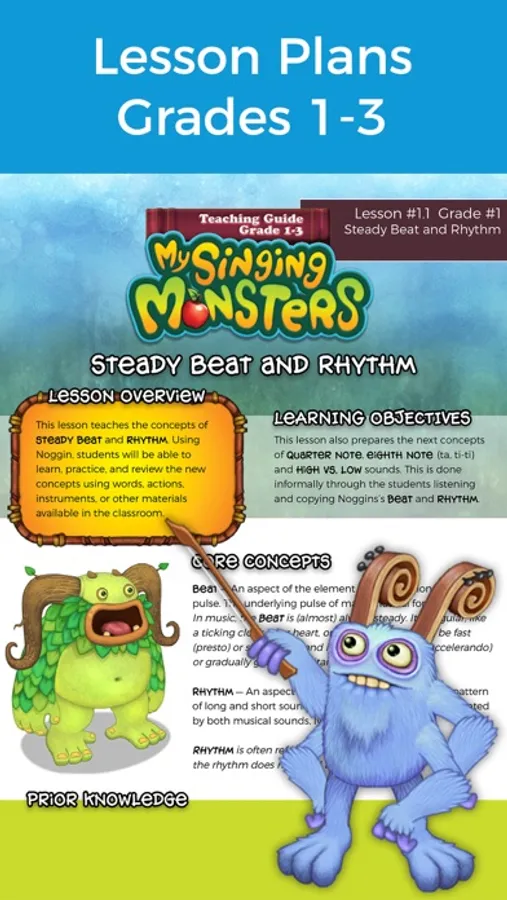 Bring the musical magic of My Singing Monsters into your classroom with the Teaching Guide Grade 1-3: My Singing Monsters app! This educational app was developed by music teachers, for music teachers, to help students learn musical theories and skills in an interactive new way. With its downloadable step-by-step lesson plans, fun characters, and colorful world, your students will love learning music fundamentals with the Singing Monsters.