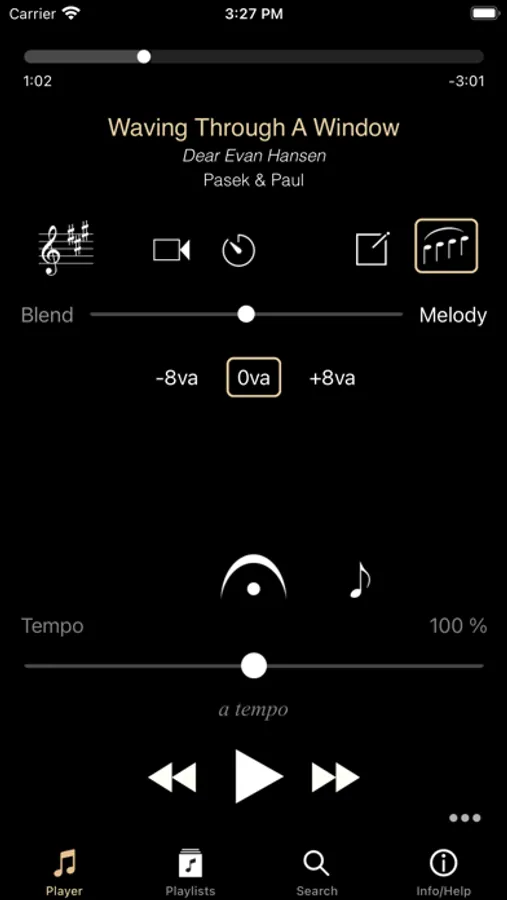 Turn a melody guide track on or off any time during play in one of three octaves and adjust level against the accompaniment.