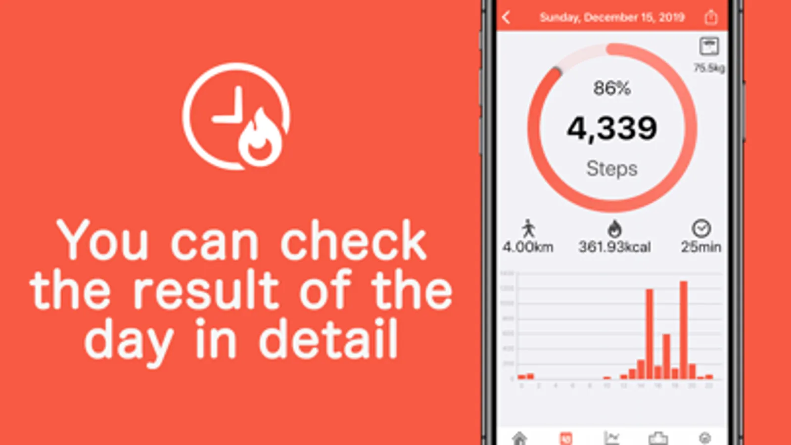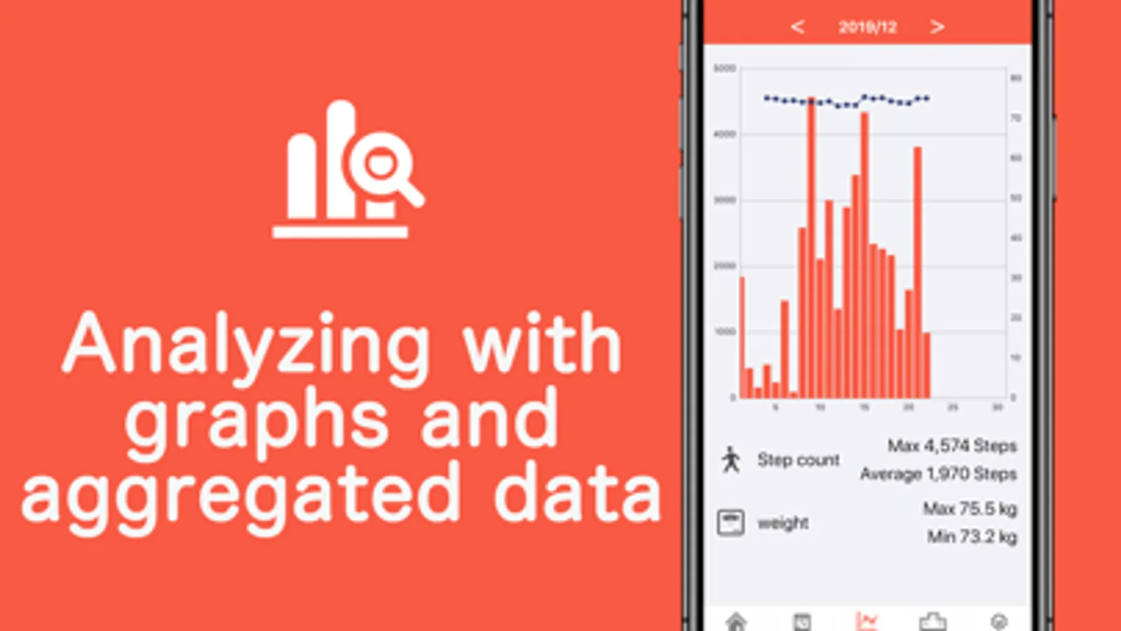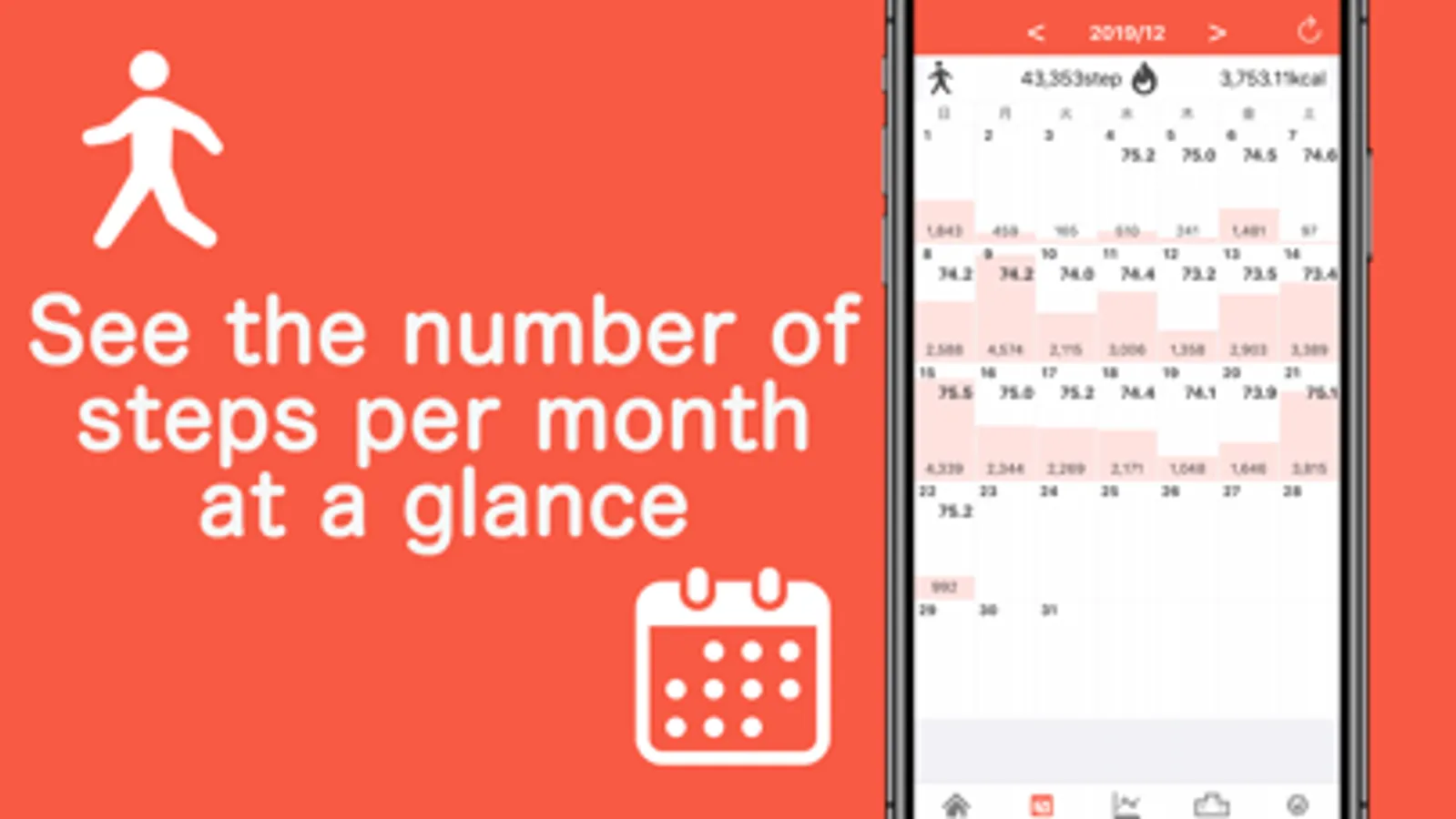 Stepy automatically calculates distance walked, calories burned, walking time, based on the number of steps. It can synchronize with all past data in iPhone's terminal. There is no binding at all such as one week ago. Also you can enter your weight for each date, so it is also recommended for diet.
