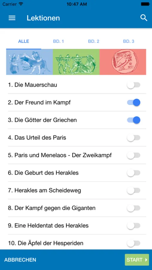 Trainingsstatistiken geben Auskunft über den jeweiligen Übungsfortschritt (gesamt und nach Mythologia-Band).