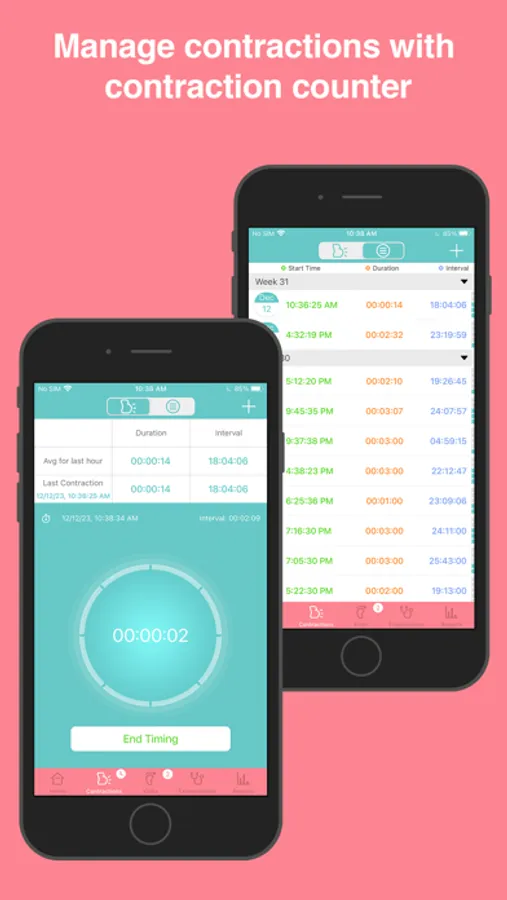 - Lists the contractions start and end time, duration and interval time in logs page.