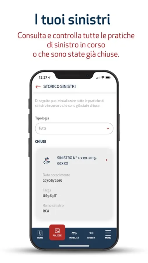 - consultare lo stato della pratica dei tuoi sinistri (auto e non auto) e ricevere notifiche a ogni aggiornamento, chiamare direttamente il perito incaricato o il liquidatore per prendere un appuntamento o chiedere informazioni sulla pratica, caricare la documentazione utile alla liquidazione;