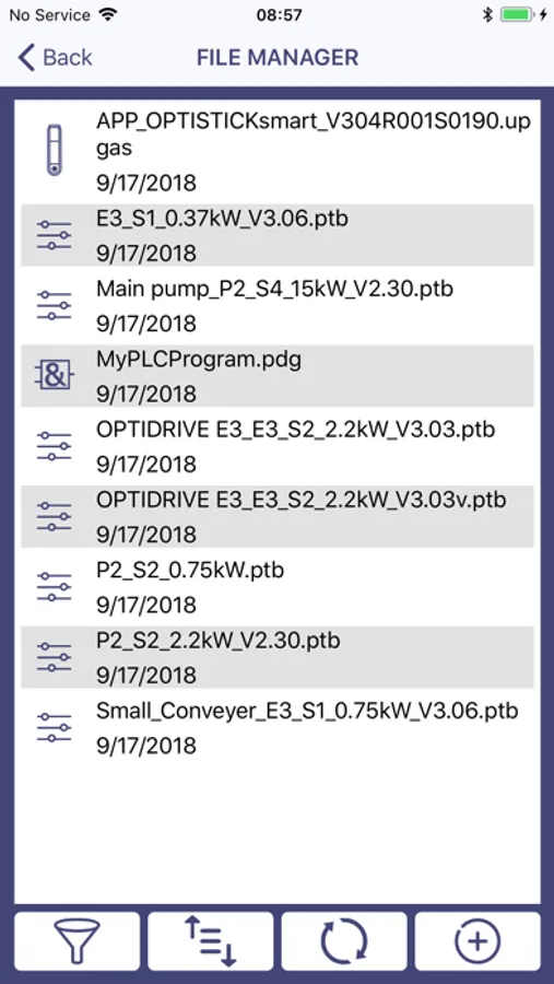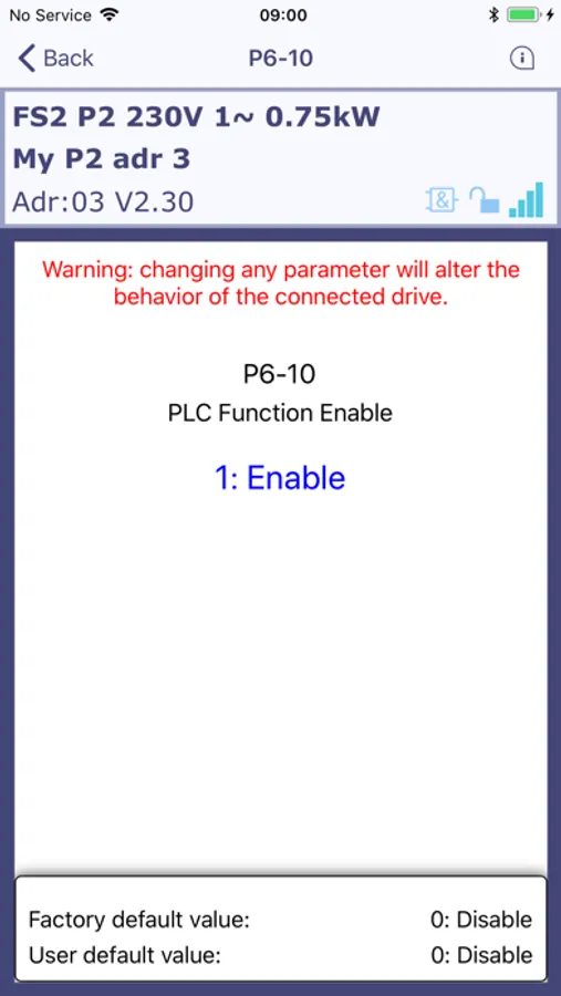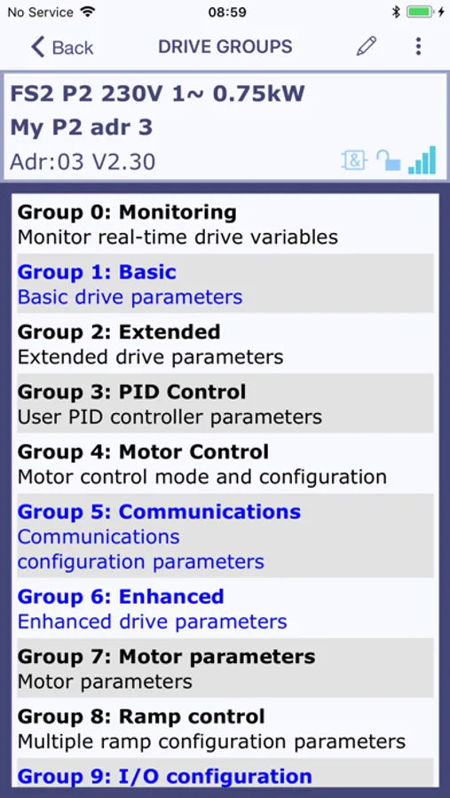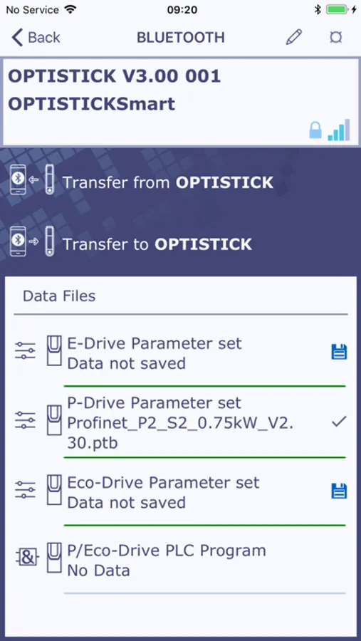 Monitor and Edit individual Optidrive parameters in real-time or transfer complete parameter sets between an Optidrive and the Smartphone. Parameter sets can be send and received via Email and are fully compatible with OptiTools Studio PC software.