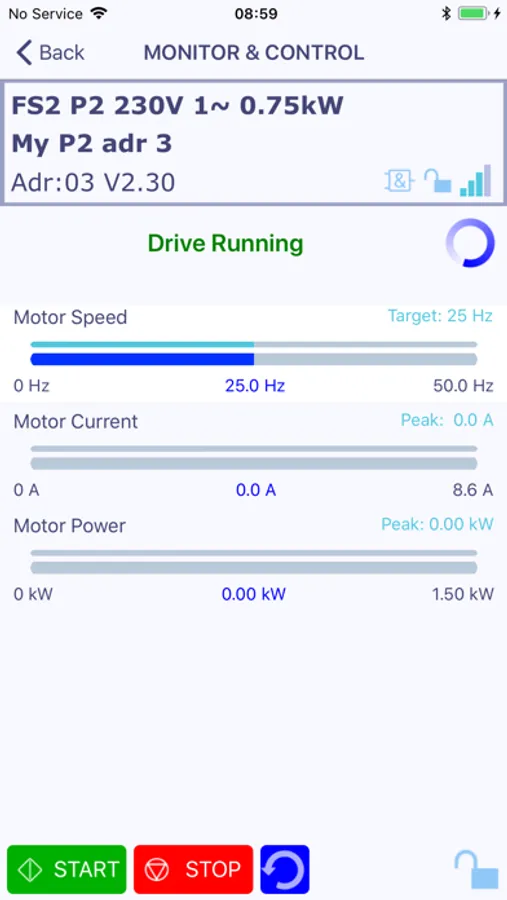 Monitor drive status, motor speed, motor current and motor power in real-time. When unlocked, the user can adjust motor speed, start the drive, stop the drive and reset trips from the Smartphone App.