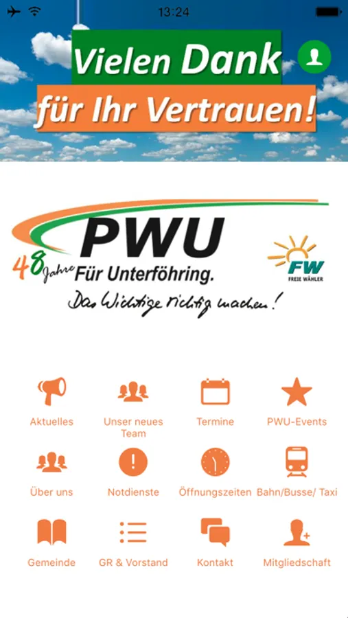 Apps werden mittlerweile von allen Altersgruppen gerne und umfassend genutzt. Wir sehen deshalb dieses Angebot als zeitgemäße und sinnvolle Ergänzung unseres Internetauftritts und zu unseren gedruckten PWU-Notizen, die in bestimmten Abständen erscheinen. Über diese App informieren wir Sie auf den Punkt gebracht kurz, knapp und schnell über wichtige Themen, die Unterföhring betreffen. Dabei legen wir hier den Schwerpunkt nur auf wirklich relevante Dinge wie Informationen zur allgemeinen Verkehrssituation im Ort, Notrufnummern, Öffnungzeiten oder wichtige Veranstaltungen in der Gemeinde.
