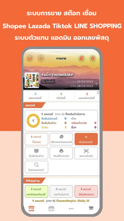 XSelly ระบบบริหารการขาย ออเดอร์ สต๊อกสินค้า ตัวแทน เชื่อมShopee Lazada Tiktok และ LINE SHOPPING พิมพ์ใบปะหน้าพร้อมเลขพัสดุจาก EMS eCo-post Flash J&T Kerry DHL BEST และอื่นๆ ไม่ต้องสลับแอปไปมา สะดวก ให้คุณทำออเดอร์ที่ไหนก็ได้ แค่ "พิมพ์ > ฉีก > แปะ"