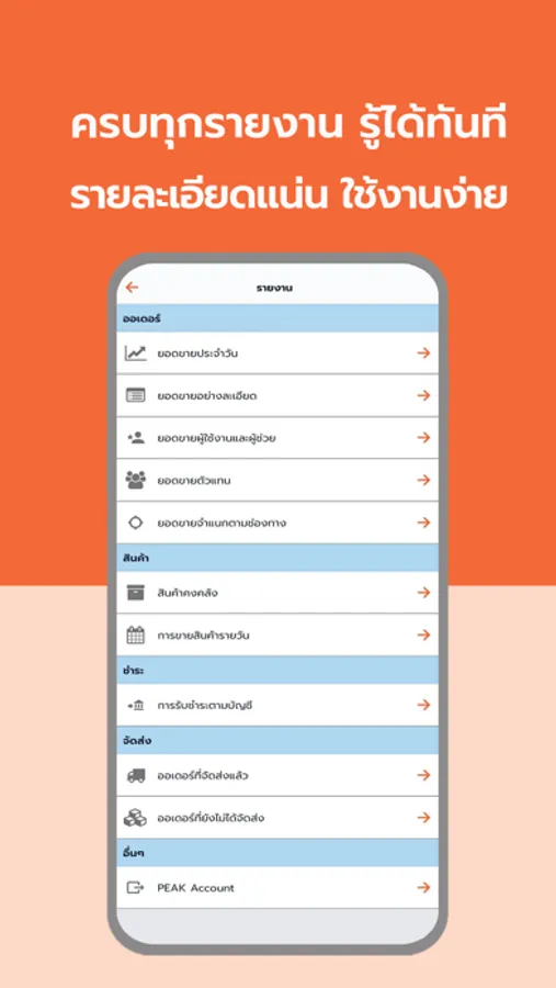 • ดูรายงานยอดขาย กำไร สรุปการจัดส่งรายวัน ยอดขายตัวแทน สินค้าจมคลัง ประวัติการเคลื่อนไหวสินค้า และอื่นๆ