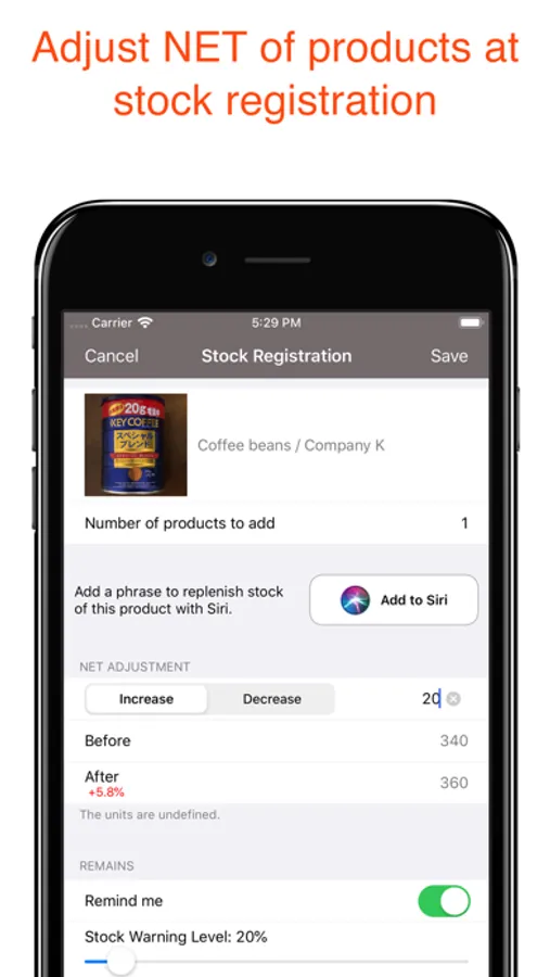 Scan the product’s barcode, and register the number of products to be replenished and the warning level of stock (e.g. 20%), standard for notifying the alarm. "Time to Buy" also supports increased weight products.