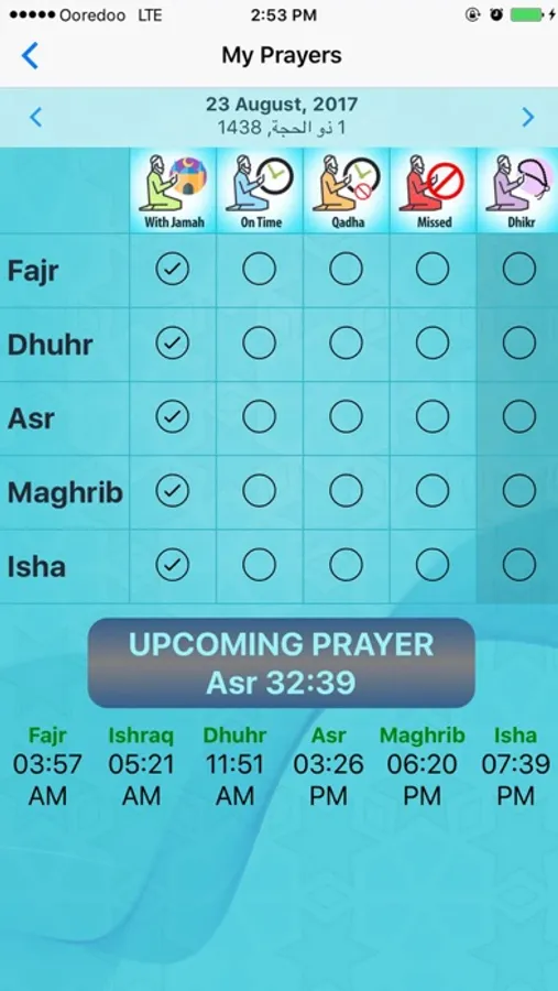 This section will let you keep record of all your daily 5 prayers, it will allow you to mark if you performed along with Jamah or Single or you missed it.