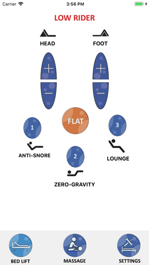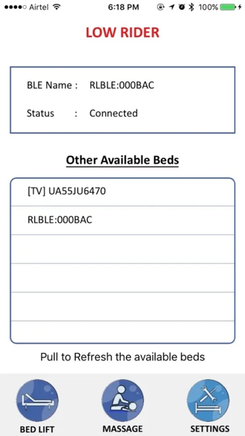 The Bob’s remote application is designed to seamlessly sync with your Low Rider Wireless Adjustable Base. With our easy setup, our app. will give you a new way to control your base. Using your smart device you can now control the (list features Head & foot up Function, Preset Memory Positions, LED, etc.) of your bed.