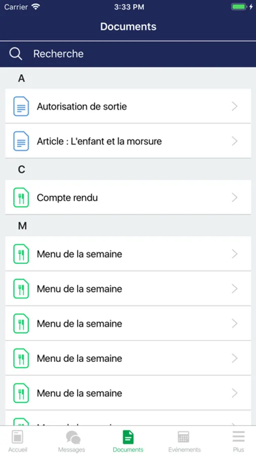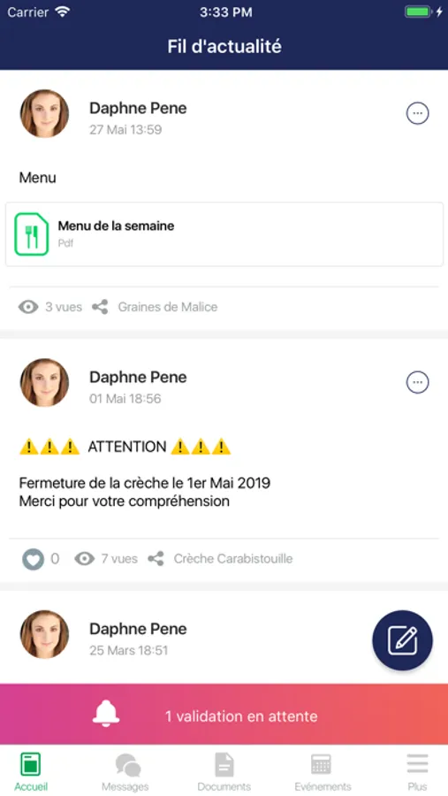 find various contents posted by childcare professionals: anecdotes, menus, appointments of the