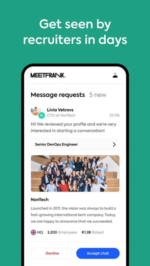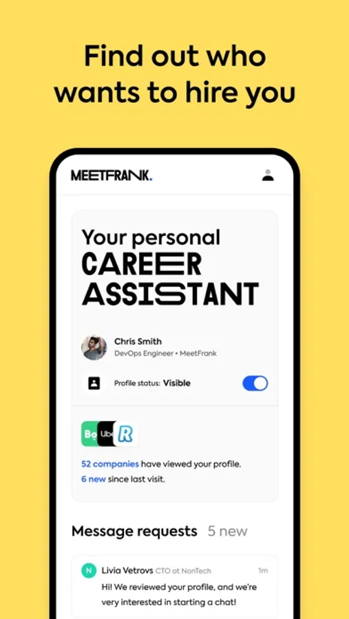 MeetFrank app helps you to be seen by 100s of recruiters and get remote job offers in days. Find out who wants to hire you – without applying to jobs.