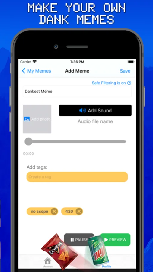 -Scroll infinitely through your favorite dank memes or make your own with an audio trimmer, image editor, and tag system.