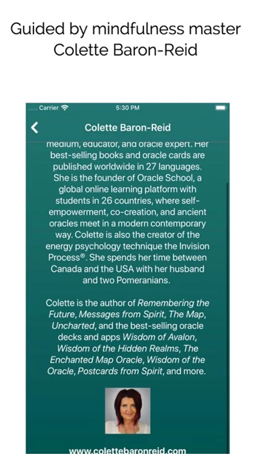Colette Baron-Reid is an internationally respected spiritual intuitive, psychic medium, educator, and oracle expert. Her best-selling books and oracle cards are published worldwide in 27 languages. She is the founder of Oracle School, a global online learning platform with students in 26 countries, where self-empowerment, co-creation, and ancient oracles meet in a modern contemporary way. Colette is also the creator of the energy psychology technique the Invision Process®. She spends her time between Canada and the USA with her husband and two Pomeranians.