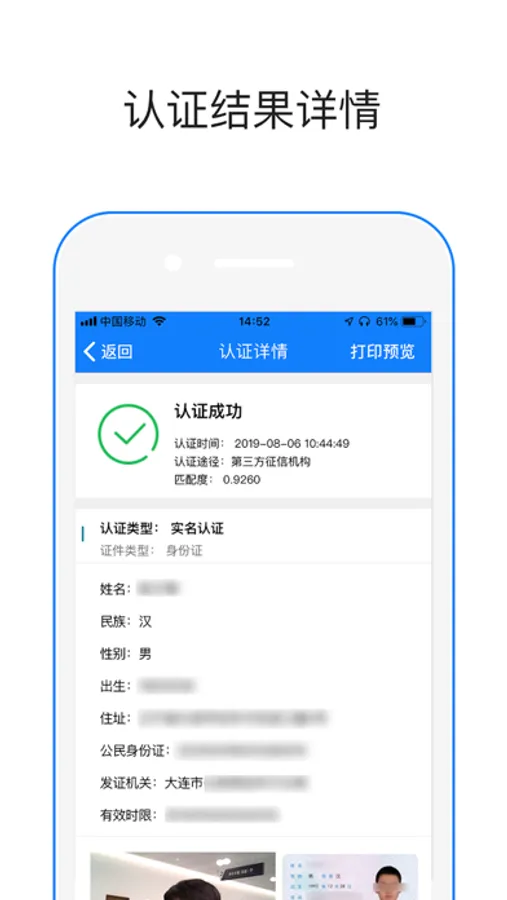 操作简单便捷:通过OCR识别/身份证读卡器自动录入当事人身份信息,验证完成可即时打印结果归档,整个操作过程不超过1分钟,高效便捷。