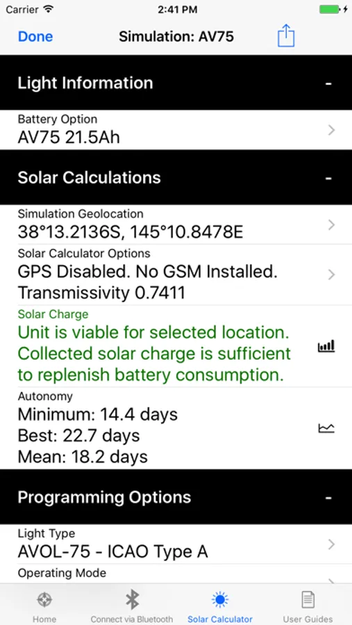 Plus using the in-built Avlite Solar Calculator, you can verify the light’s ability to operate in a set location using the device GPS co-ordinates or manually select a global location from anywhere in the world. The solar calculator will determine the average sunlight hours for the given location, power requirements and provide a result to the user on suitability.