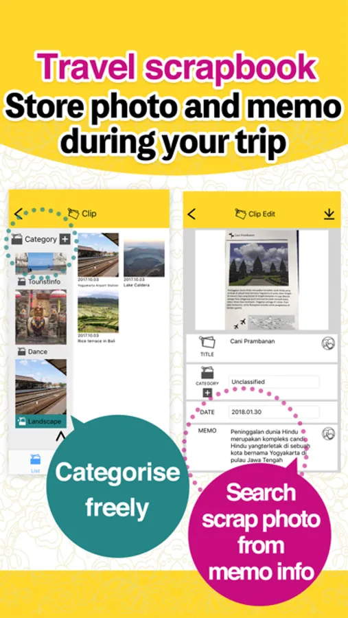 Clip parts of captured photo and add dates, title, and memo or categorize.