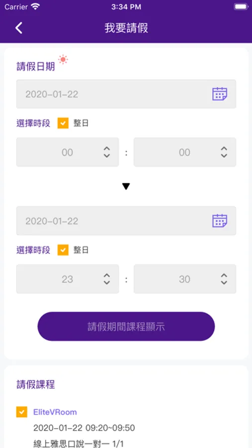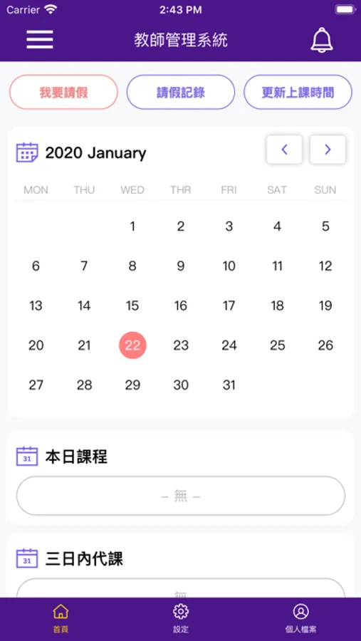 1.「首頁」:查看當月課表、當日/三日內課程、最新公告等重要資訊;並可操作「我要請假」、「請假記錄」、「更新上課時間」等功能。