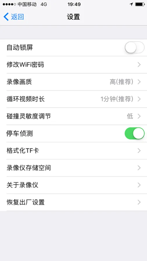 ● 通过手机APP可以设置行车录像仪的各种参数(Wi-Fi密码,循环录像,录像画质,碰撞灵敏度...)以及时间同步和SD卡格式化等功能,查看行车录像仪固件版本和APP版本功能。